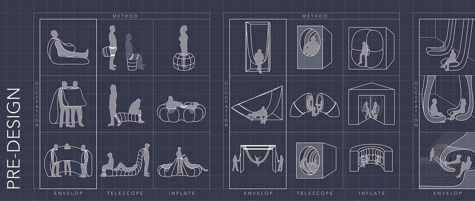 ‘Malleable Surface’ explores various relationships between surface, body, and container through the invention of a new, reconfigurable system. In this instance, the system is shown in a train application to show how it functions when spatial conditions are restrictive. However, the malleable surface system would theoretically be able to be implemented in other types of spaces as well.